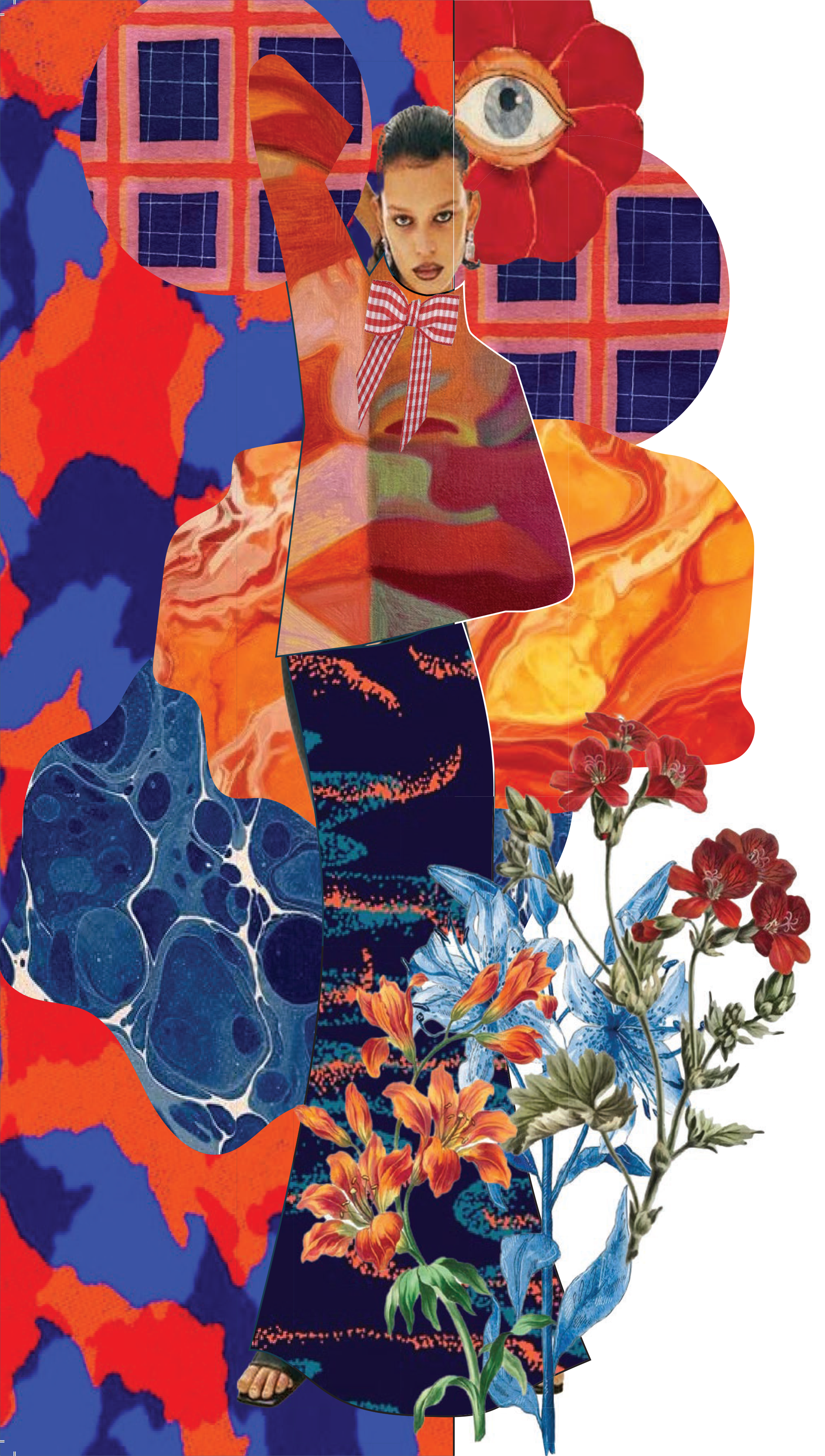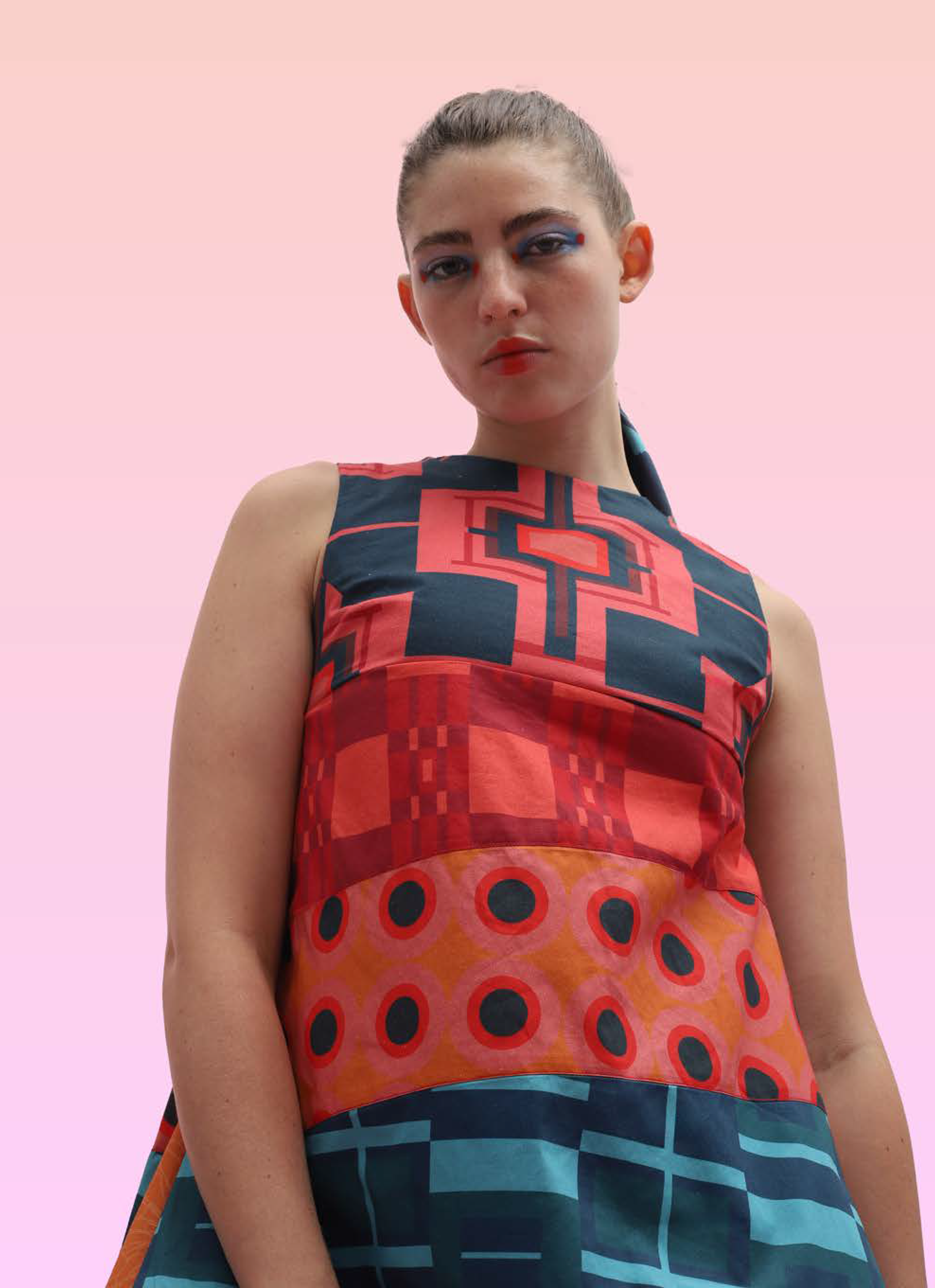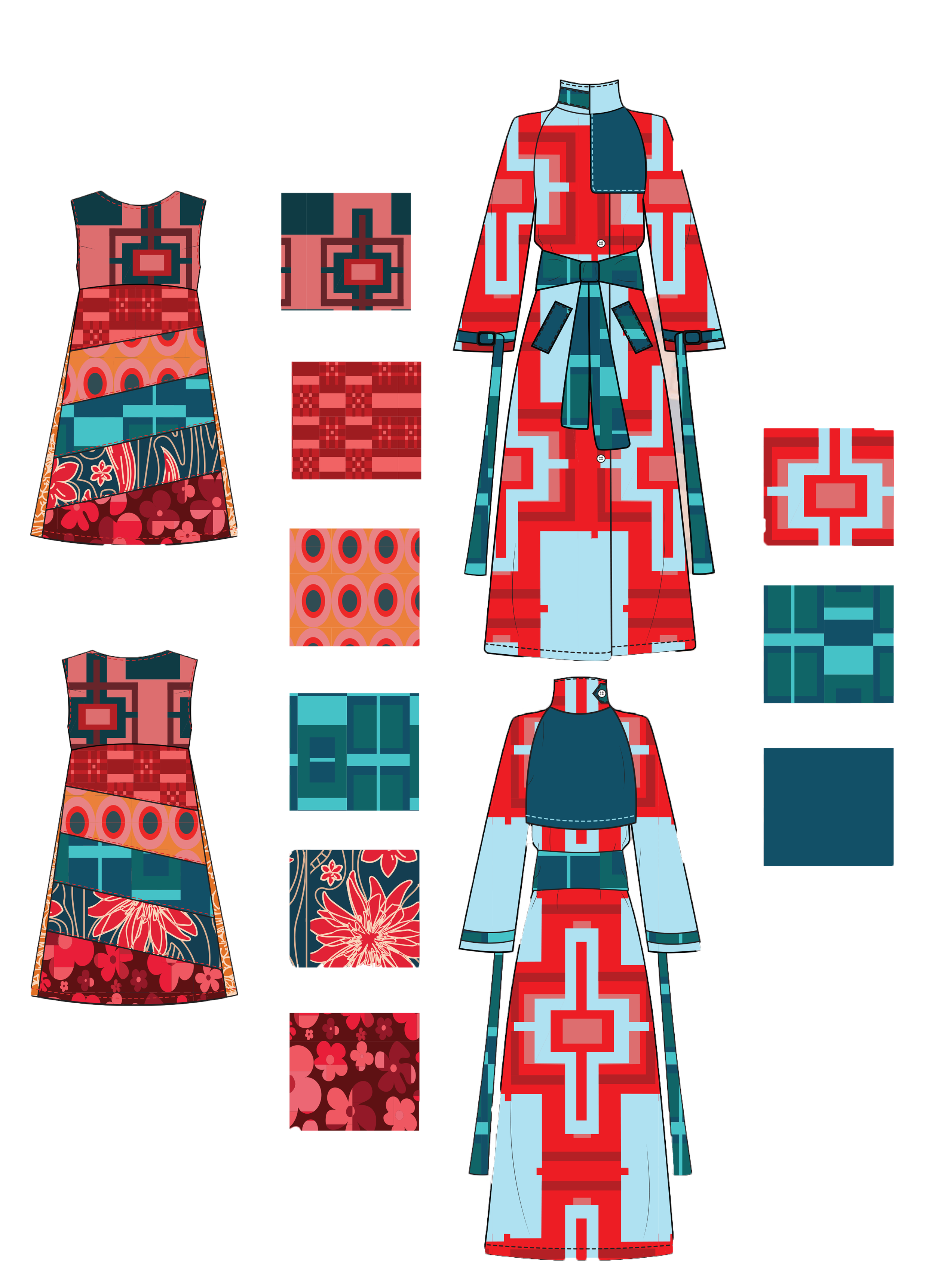 letting the bold colours and expressive motifs take centre stage. The oversized trench coat adds structure, balancing out the playful shift and baby doll dresses while tying everything together through shared colours and repeating patterns. The collection is designed for an audience that appreciates individuality and creativity—women who see clothing not just as fashion, but as an extension of their personality and mood. They are drawn to garments that tell a story, balancing elegance with a sense of play. For them, wearing art is a way of expressing confidence and joy, stepping away from minimalism into pieces that feel alive with colour and movement.